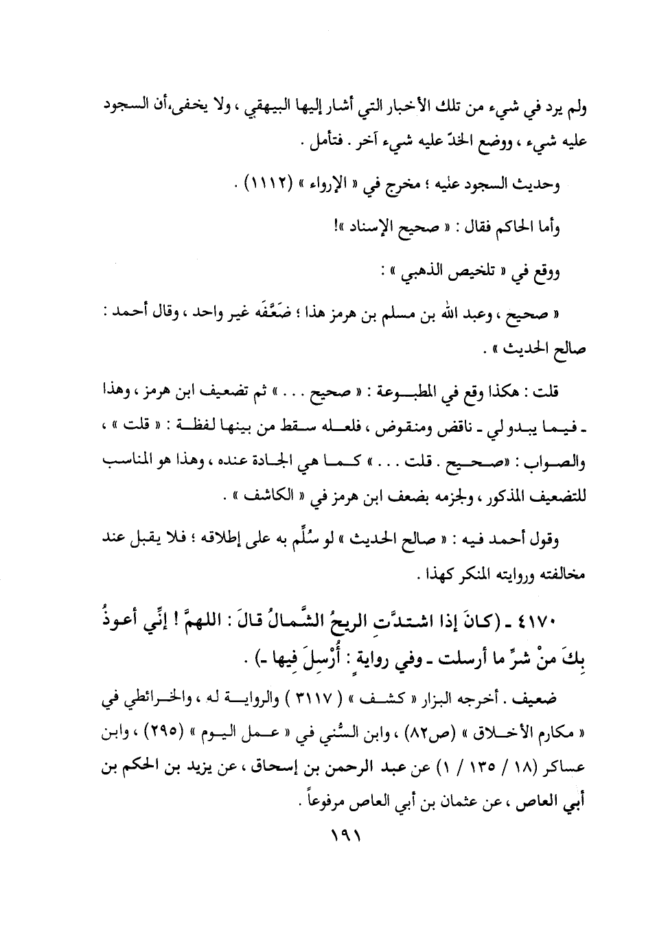 4170 - (كان إذا اشتدت الريح الشمال قال: اللهم! إني أعوذ بك من شر ما أرسلت - وفي رواية: أرسل فيها -) .