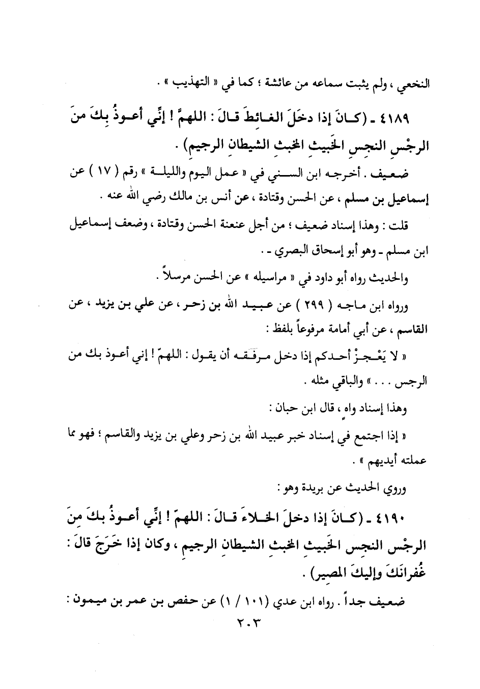 4189 - (كان إذا دخل الغائط قال: اللهم! إني أعوذ بك من الرجس النجس الخبيث المخبث الشيطان الرجيم) .
