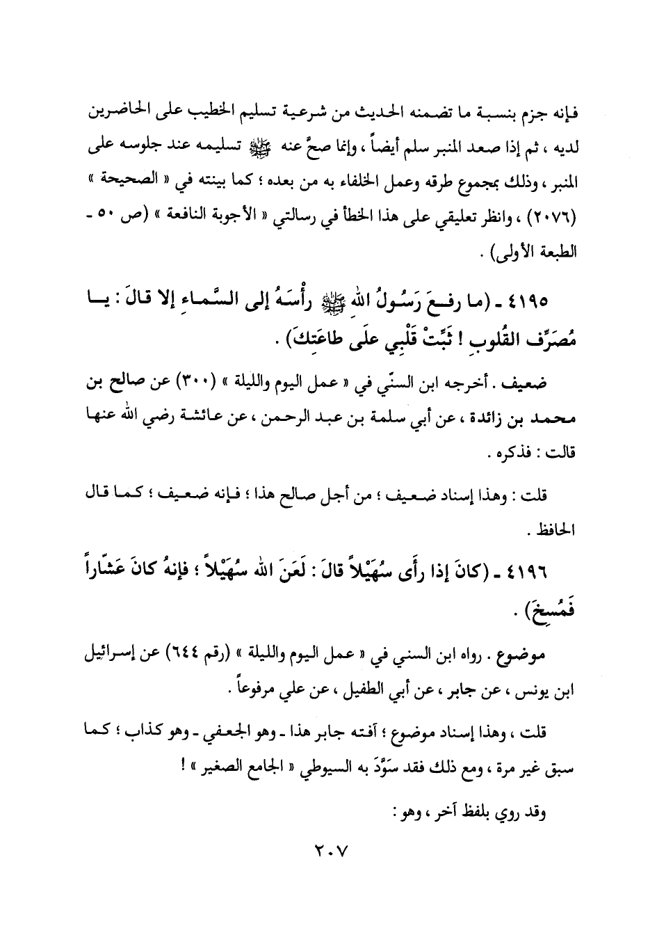 فإنه جزم بنسبة ما تضمنه الحديث من شرعية تسليم الخطيب على الحاضرين لديه، ثم إذا صعد المنبر سلم أيضاً، وإنما صح عنه - صلى الله عليه وسلم - تسليمه عند جلوسه على المنبر، وذلك بمجموع طرقه وعمل الخلفاء به من بعده؛ كما بينته في "الصحيحة" (2076) ، وانظر تعليقي على هذا الخطأ في رسالتي "الأجوبة النافعة" (ص 50 - الطبعة الأولى) .