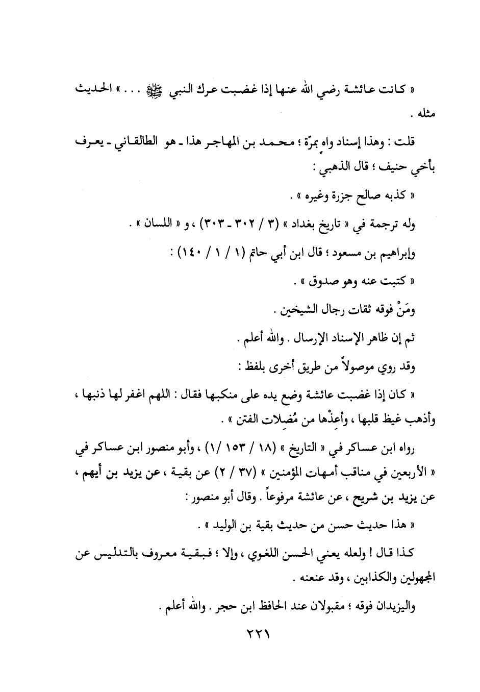 "كان إذا غضبت عائشة وضع يده على منكبها فقال: اللهم اغفر لها ذنبها، وأذهب غيظ قلبها، وأعذها من مضلات الفتن".
