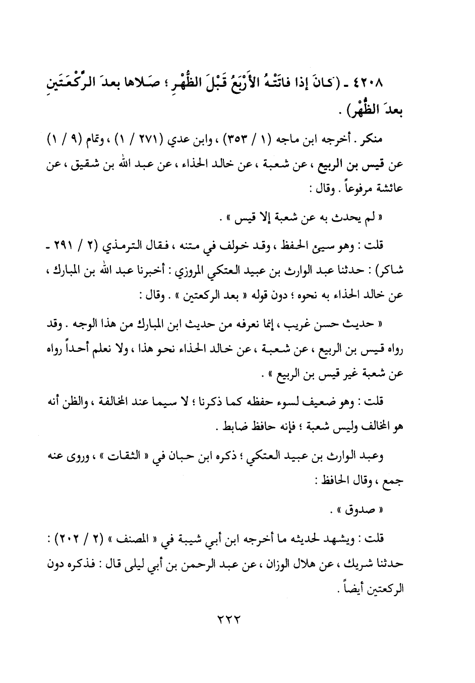 4208 - (كان إذا فاتته الأربع قبل الظهر؛ صلاها بعد الركعتين بعد الظهر) .