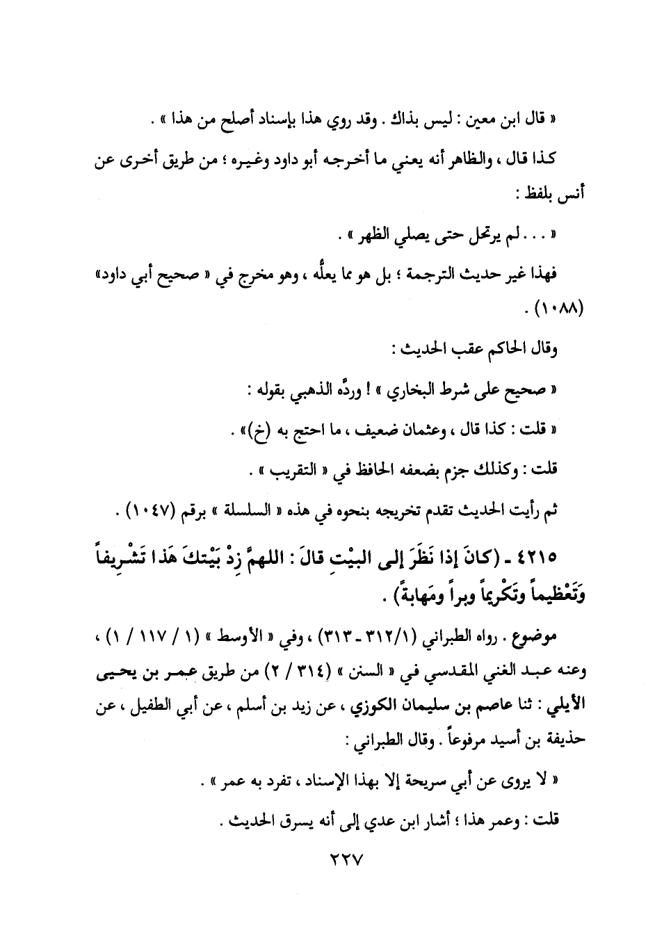 4215 - (كان إذا نظر إلى البيت قال: اللهم زد بيتك هذا تشريفاً وتعظيماً وتكريماً وبراً ومهابة) .