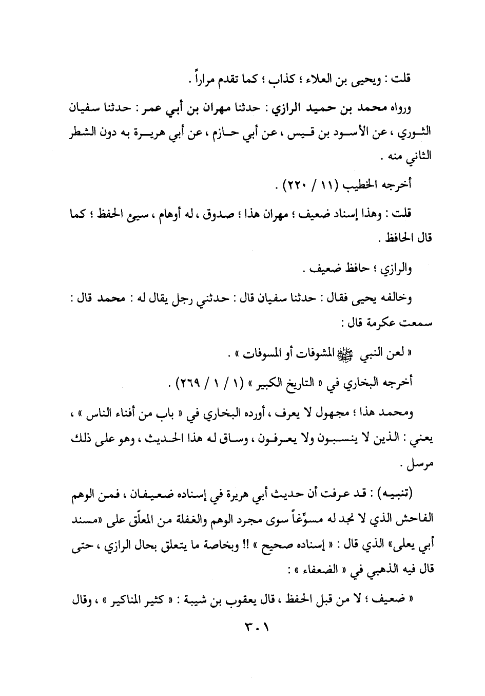 (تنبيه) : قد عرفت أن حديث أبي هريرة في إسناده ضعيفان، فمن الوهم الفاحش الذي لا نجد له مسوغاً سوى مجرد الوهم والغفلة من المعلق على "مسند أبي يعلى" الذي قال: "إسناده صحيح"!! وبخاصة ما يتعلق بحال الرازي، حتى قال فيه الذهبي في "الضعفاء":