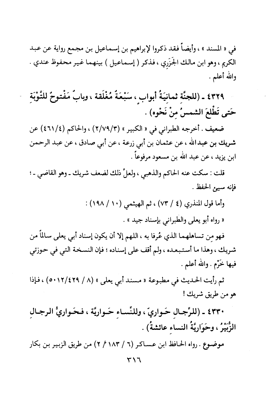 4329 - (للجنة ثمانية أبواب، سبعة مغلقة، وباب مفتوح للتوبة حتى تطلع الشمس من نحوه) .