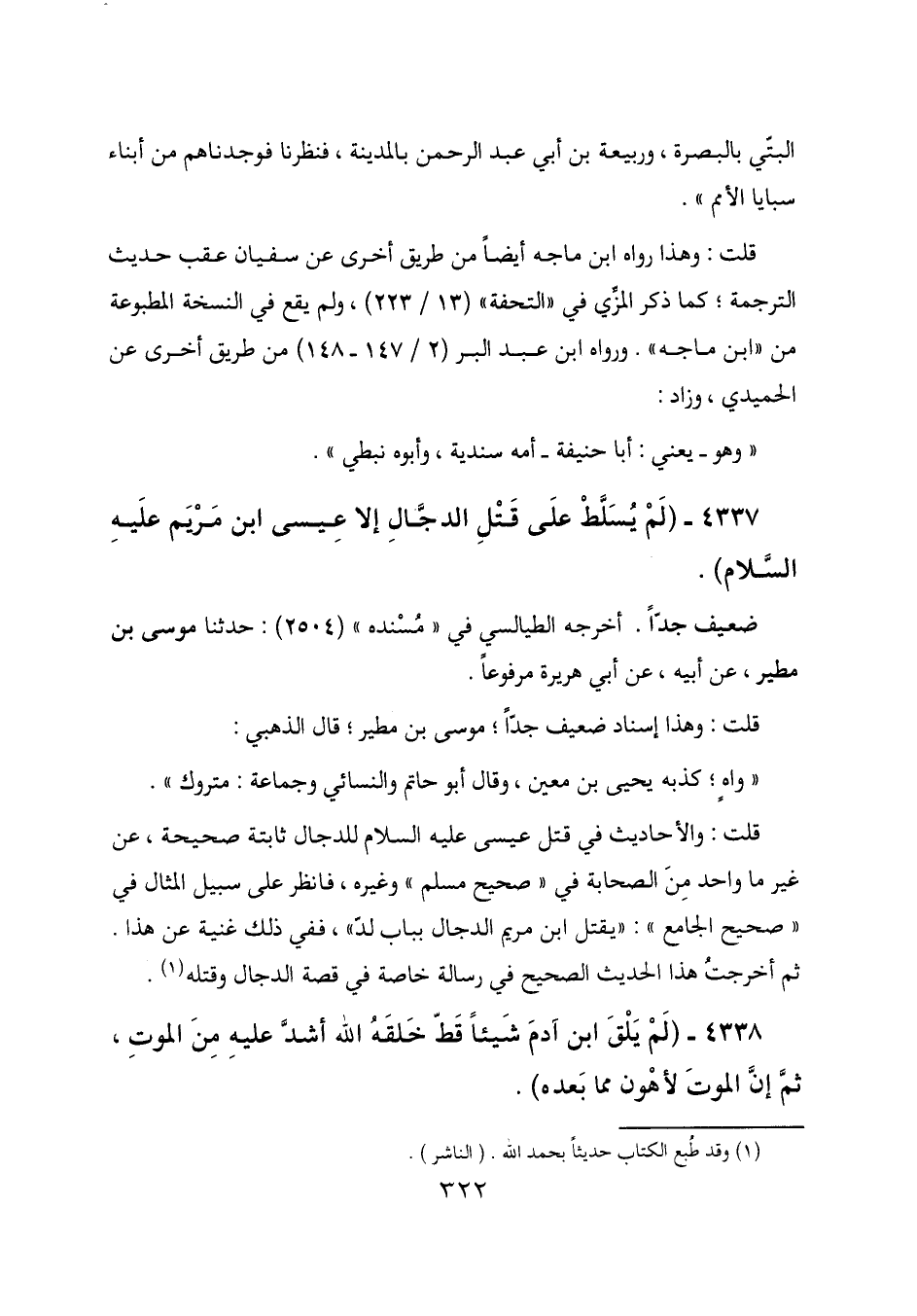 4337 - (لم يسلط على قتل الدجال إلا عيسى ابن مريم عليه السلام) .