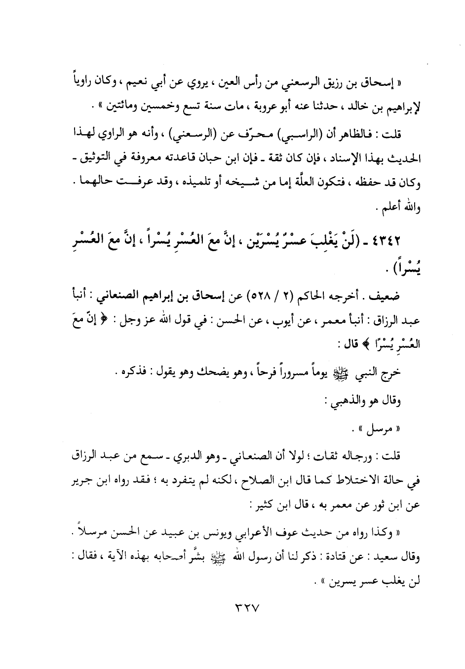 4342 - (لن يغلب عسر يسرين، إن مع العسر يسراً، إن مع العسر يسراً) .