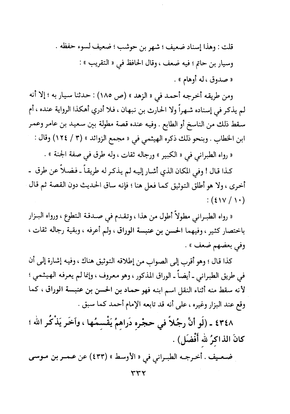 كذا قال؛ وهو أقرب إلى الصواب من إطلاقه التوثيق هناك، وفيه إشارة إلى أن في طريق الطبراني - أيضاً - الوراق المذكور، وهو معروف، وإنما لم يعرفه الهيثمي؛ لأنه سقط منه أثناء النقل اسم ابنه فهو حماد بن الحسن بن عنبسة الوراق، كما وقع عند البزار وغيره، على أنه قد تابعه الإمام أحمد كما سبق.