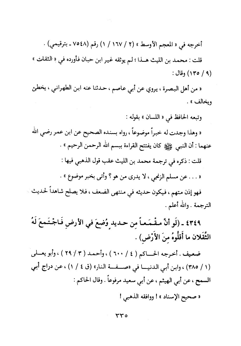 4349 - (لو أن مقمعاً من حديد وضع في الأرض فاجتمع له الثقلان ما أقلوه من الأرض) .