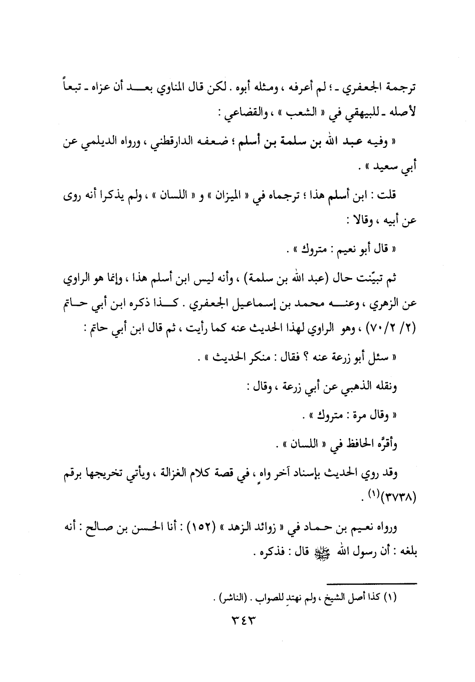ثم تبينت حال (عبد الله بن سلمة) ، وأنه ليس ابن أسلم هذا، وإنما هو الراوي عن الزهري، وعنه محمد بن إسماعيل الجعفري. كذا ذكره ابن أبي حاتم (2/ 2/ 70) ، وهو الراوي لهذا الحديث عنه كما رأيت، ثم قال ابن أبي حاتم: