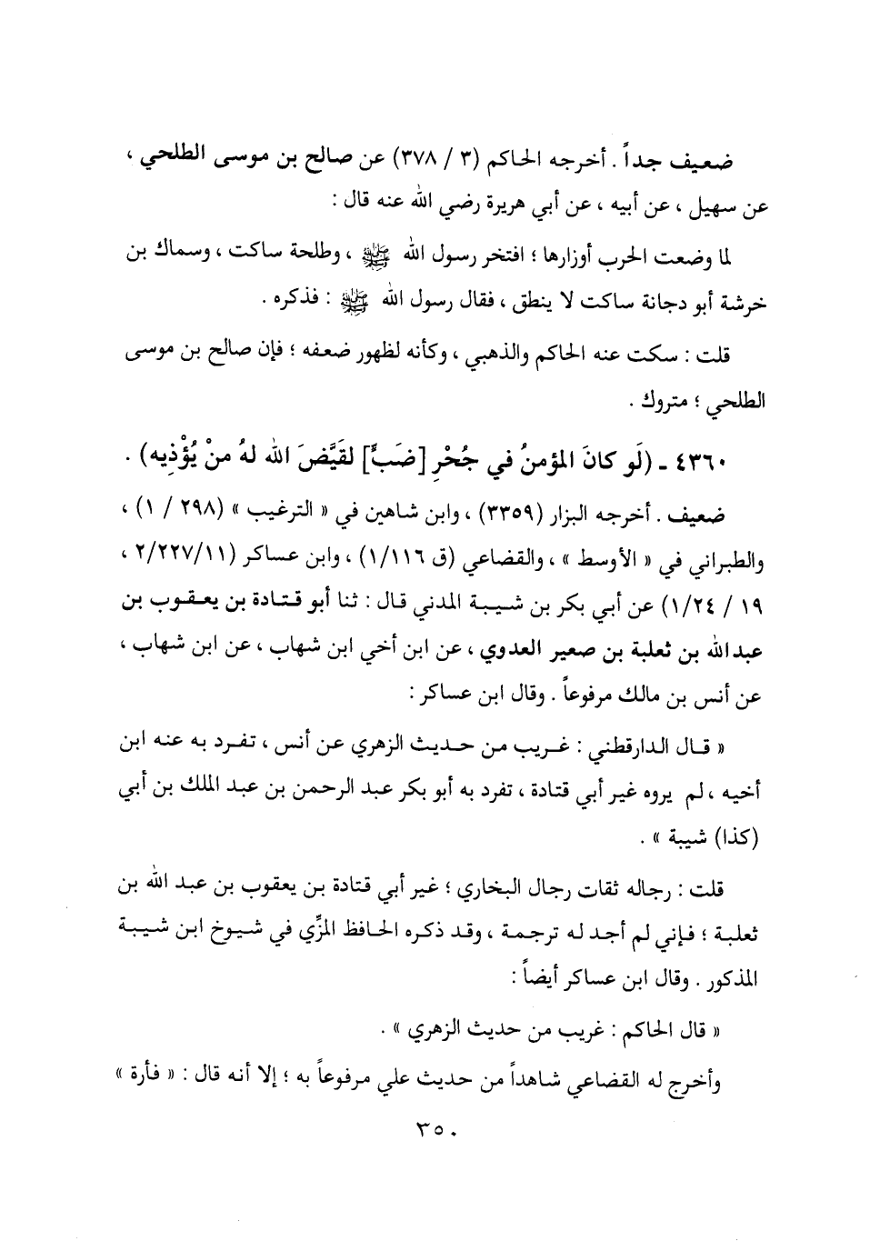 "قال الدارقطني: غريب من حديث الزهري عن أنس، تفرد به عنه ابن أخيه، لم يروه غير أبي قتادة، تفرد به أبو بكر عبد الرحمن بن عبد الملك بن أبي (كذا) شيبة".