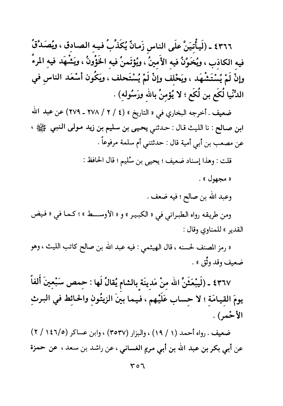 4367 - (ليبعثن الله من مدينة بالشام يقال لها: حمص سبعين ألفاً يوم القيامة؛ لا حساب عليهم، فيما بين الزيتون والحائط في البرث الأحمر) .