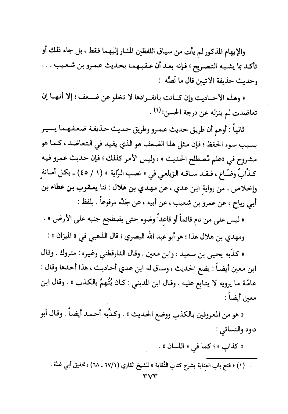 ثانياً: أوهم أن طريق حديث عمرو وطريق حديث حذيفة ضعفهما يسير بسبب سوء الحفظ؛ فإن مثل هذا الضعف هو الذي يفيد في التعاضد، كما هو مشروح في "علم مصطلح الحديث"، وليس الأمر كذلك؛ فإن حديث عمرو فيه كذاب وضاع، فقد ساقه الزيلعي في "نصب الراية" (1/ 45) - بكل أمانة وإخلاص - من رواية ابن عدي، عن مهدي بن هلال: حدثنا يعقوب بن عطاء بن أبي رباح، عن عمرو بن شعيب، عن أبيه، عن جده مرفوعاً. بلفظ: