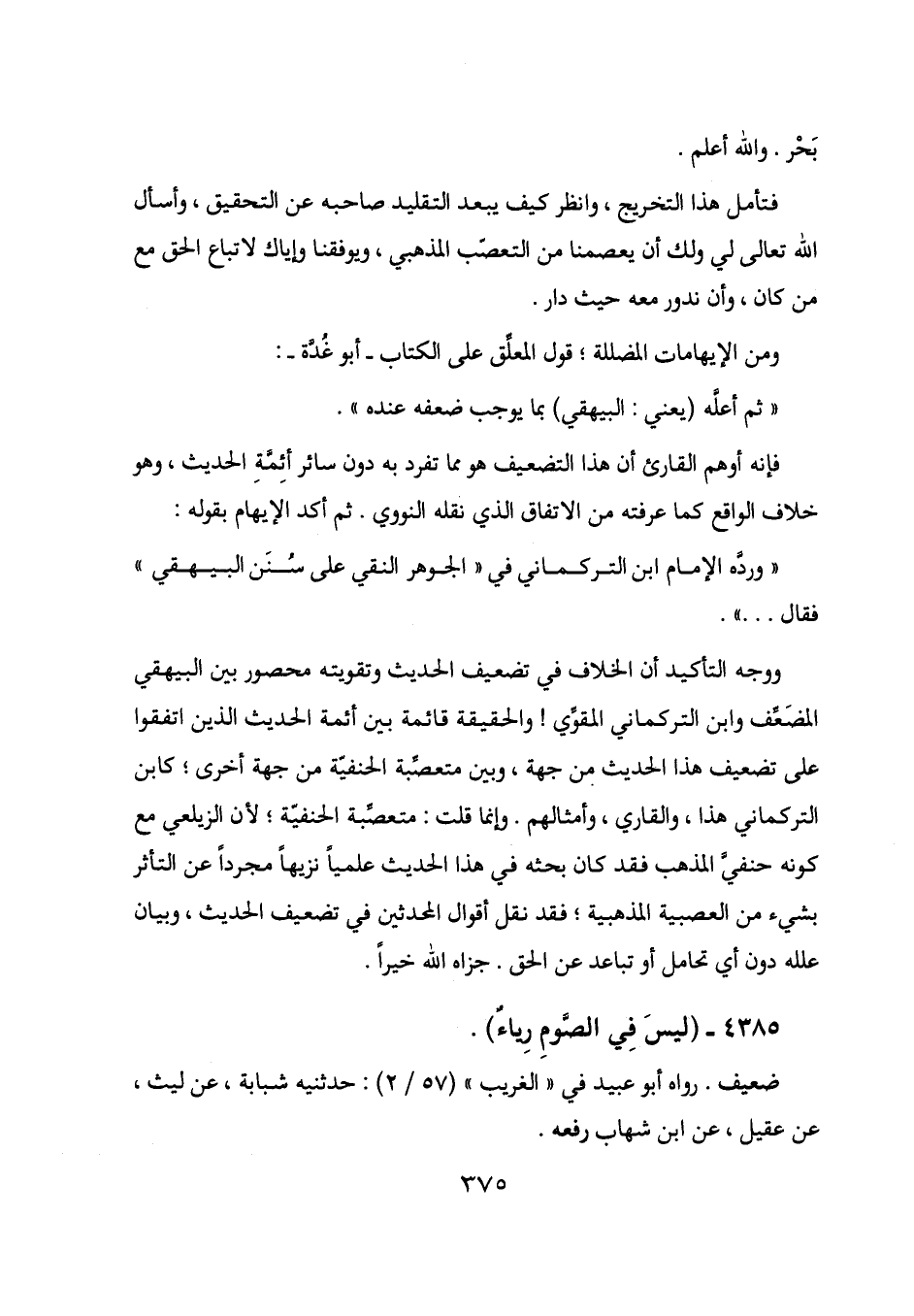 ووجه التأكيد أن الخلاف في تضعيف الحديث وتقويته محصور بين البيهقي المضعف وابن التركماني المقوي! والحقيقة قائمة بين أئمة الحديث الذين اتفقوا على تضعيف هذا الحديث من جهة، وبين متعصبة الحنفية من جهة أخرى؛ كابن التركماني هذا، والقاري، وأمثالهم. وإنما قلت: متعصبة الحنفية؛ لأن الزيلعي مع كونه حنفي المذهب فقد كان بحثه في هذا الحديث علمياً نزيهاً مجرداً عن التأثر بشيء من العصبية المذهبية؛ فقد نقل أقوال المحدثين في تضعيف الحديث، وبيان علله دون أي تحامل أو تباعد عن الحق. جزاه الله خيراً.