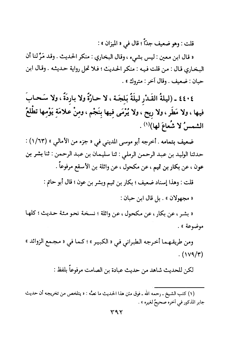 4404 - (ليلة القدر ليلة بلجة، لا حارة ولا باردة، ولا سحاب فيها، ولا مطر، ولا ريح، ولا يرمى فيها بنجم، ومن علامة يومها تطلع الشمس لا شعاع لها) (1) .