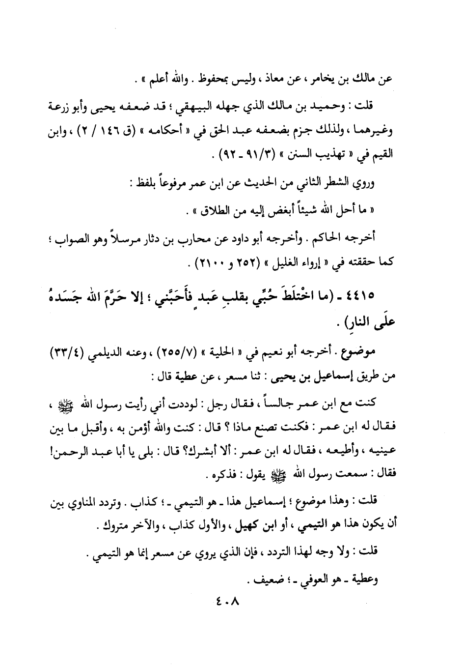 قلت: وهذا موضوع؛ إسماعيل هذا - هو التيمي -؛ كذاب. وتردد المناوي بين أن يكون هذا هو التيمي، أو ابن كهيل، والأول كذاب، والآخر متروك.
