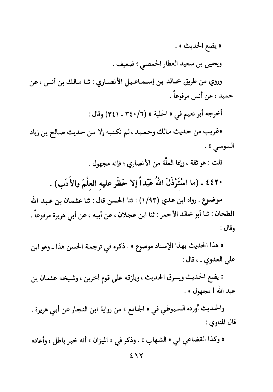 "هذا الحديث بهذا الإسناد موضوع". ذكره في ترجمة الحسن هذا - وهو ابن علي العدوي -، قال: