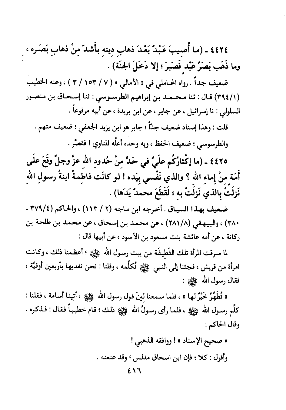 4425 - (ما إكثاركم علي في حد من حدود الله عز وجل وقع على أمة من إماء الله؟ والذي نفسي بيده! لو كانت فاطمة ابنة رسول الله نزلت بالذي نزلت به؛ لقطع محمد يدها) .