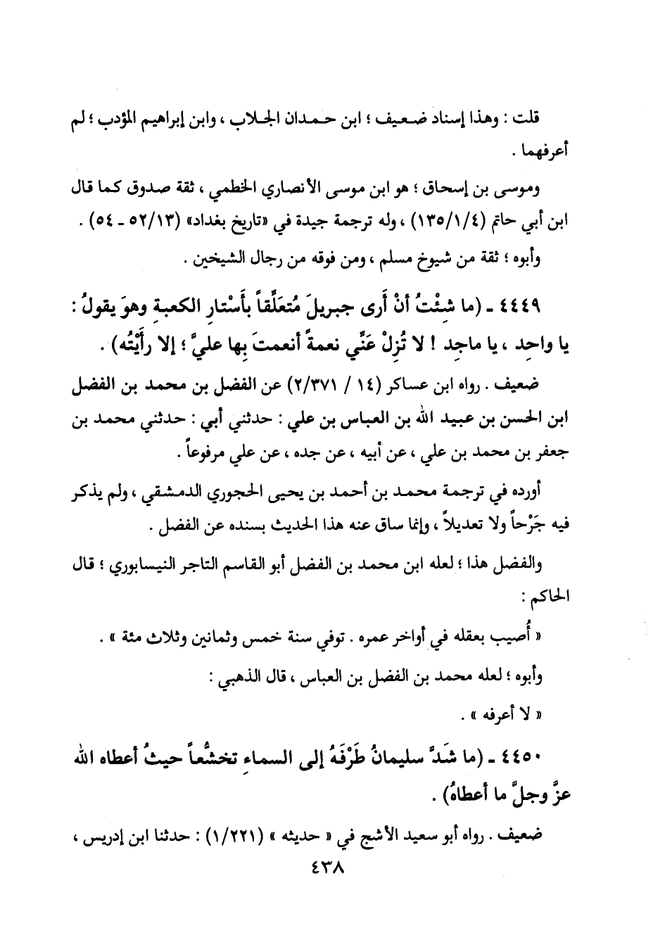 4449 - (ما شئت أن أرى جبريل متعلقاً بأستار الكعبة وهو يقول: يا واحد، يا ماجد! لا تزل عني نعمة أنعمت بها علي؛ إلا رأيته) .