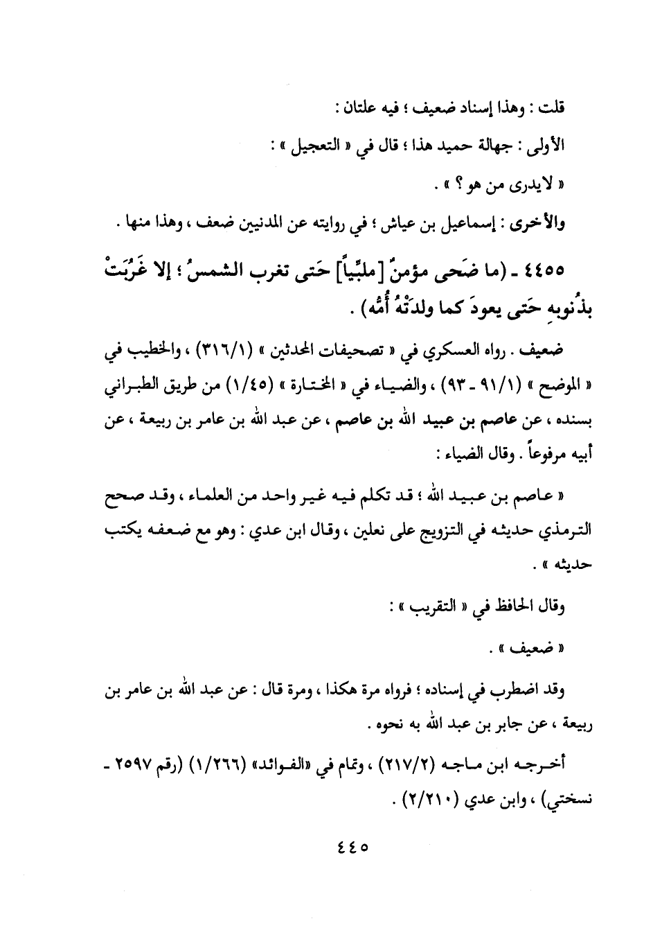رواه العسكري في "تصحيفات المحدثين" (1/ 316) ، والخطيب في "الموضح" (1/ 91-93) ، والضياء في "المختارة" (45/ 1) من طريق الطبراني بسنده، عن عاصم بن عبيد الله بن عاصم، عن عبد الله بن عامر بن ربيعة، عن أبيه مرفوعاً. وقال الضياء:
