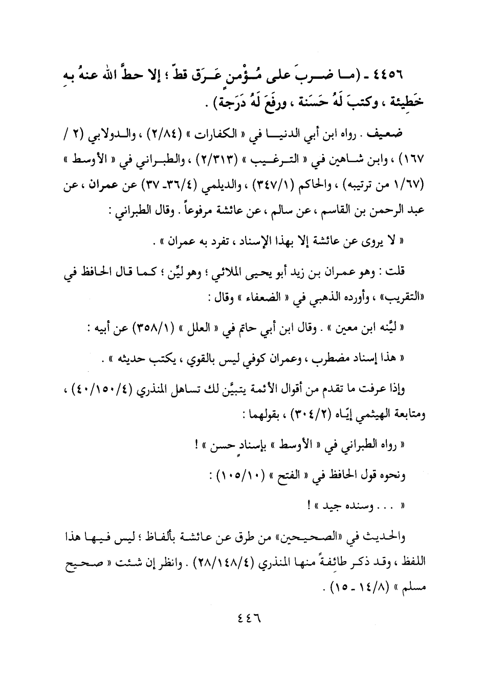 وإذا عرفت ما تقدم من أقوال الأئمة يتبين لك تساهل المنذري (4/ 150/ 40) ، ومتابعة الهيثمي إياه (2/ 304) ، بقولهما: