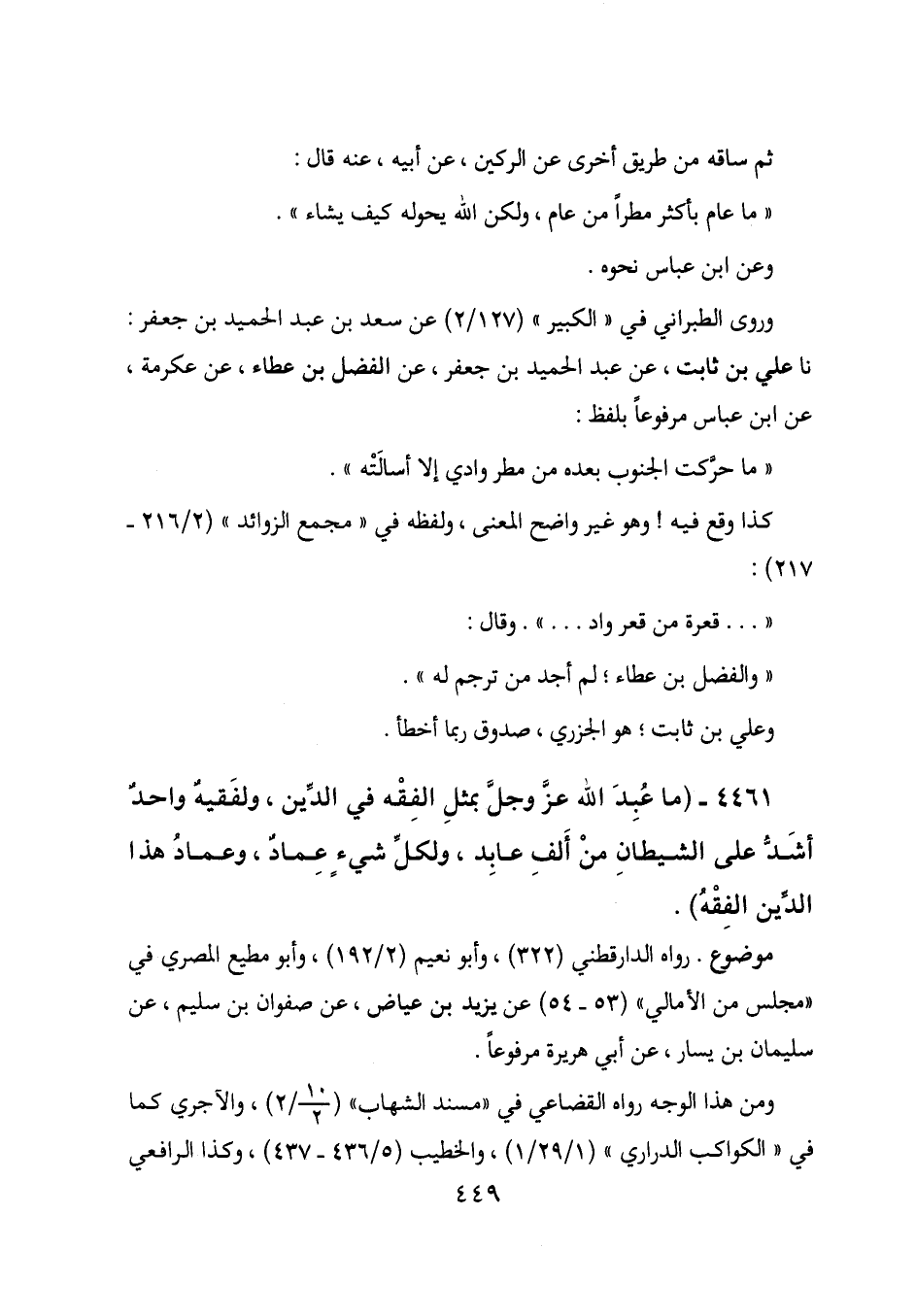 4461 - (ما عبد الله عز وجل بمثل الفقه في الدين، ولفقيه واحد أشد على الشيطان من ألف عابد، ولكل شيء عماد، وعماد هذا الدين الفقه) .