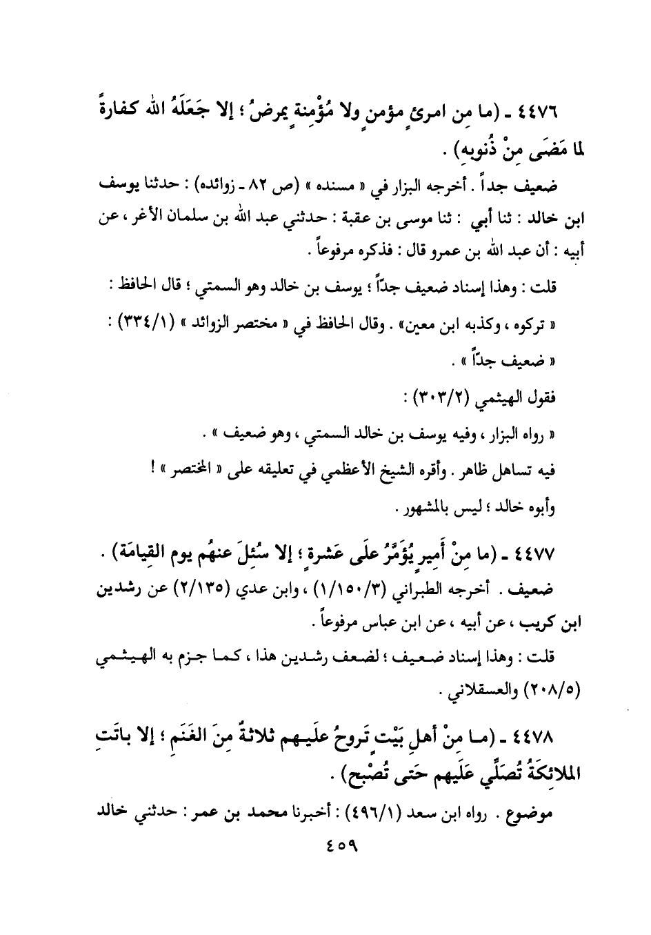 4478 - (ما من أهل بيت تروح عليهم ثلاثة من الغنم؛ إلا باتت الملائكة تصلي عليهم حتى تصبح) .