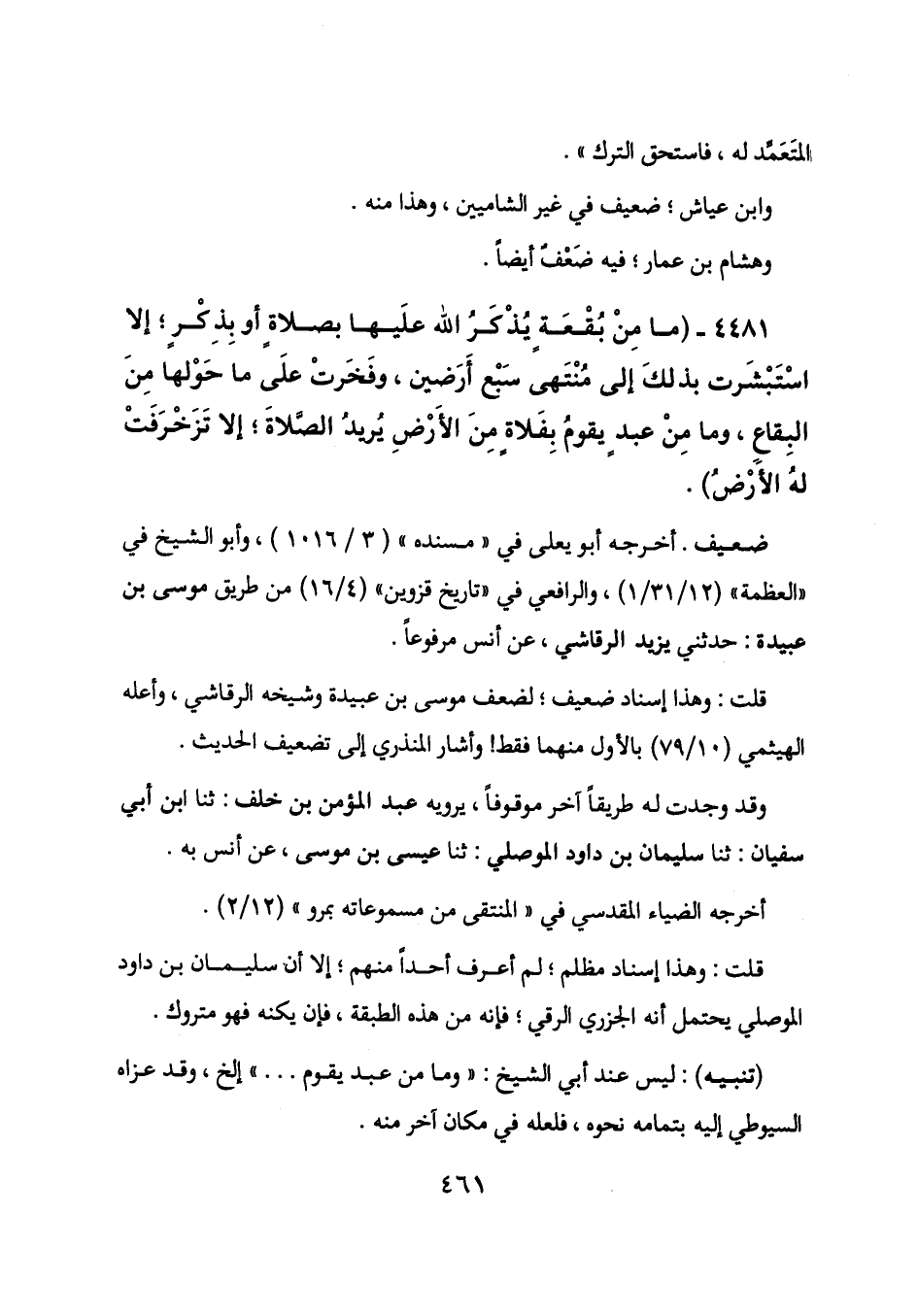 4481 - (ما من بقعة يذكر الله عليها بصلاة أو بذكر؛ إلا استبشرت بذلك إلى منتهى سبع أرضين، وفخرت على ما حولها من البقاع، وما من عبد يقوم بفلاة من الأرض يريد الصلاة؛ إلا تزخرفت له الأرض) .