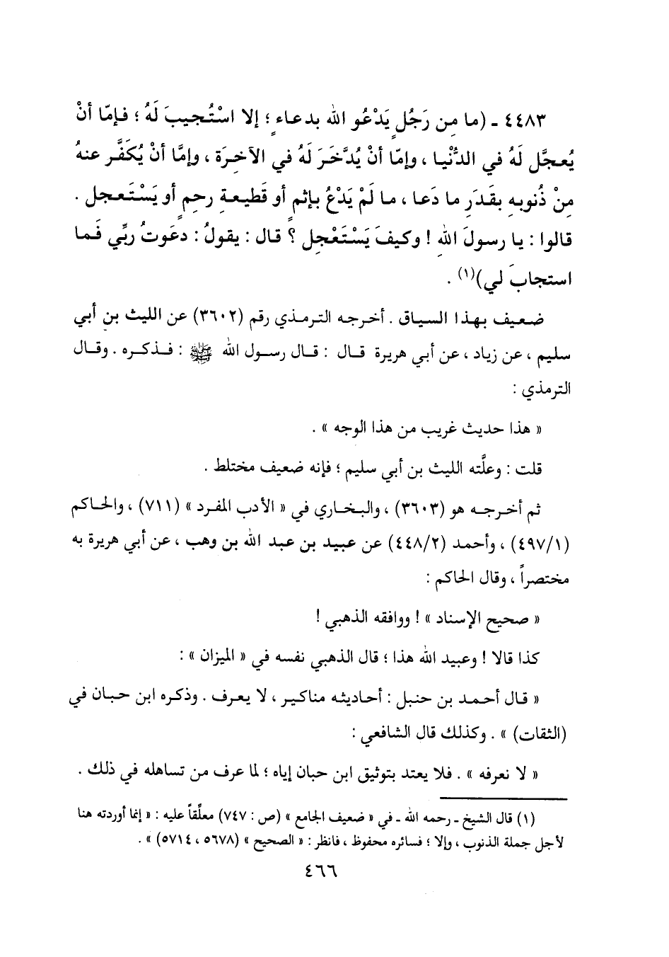 4483 - (ما من رجل يدعو الله بدعاء؛ إلا استجيب له؛ فإما أن يعجل له في الدنيا، وإما أن يدخر له في الآخرة، وإما أن يكفر عنه من ذنوبه بقدر ما دعا، ما لم يدع بإثم أو قطيعة رحم أو يستعجل. قالوا: يا رسول الله! وكيف يستعجل؟ قال: يقول: دعوت ربي فما استجاب لي) (1) .