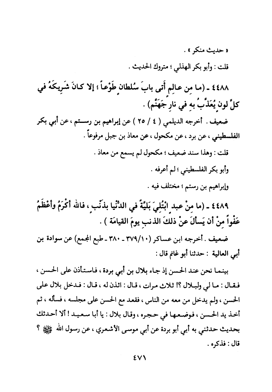 4488 - (ما من عالم أتى باب سلطان طوعاً؛ إلا كان شريكه في كل لون يعذب به في نار جهنم) .