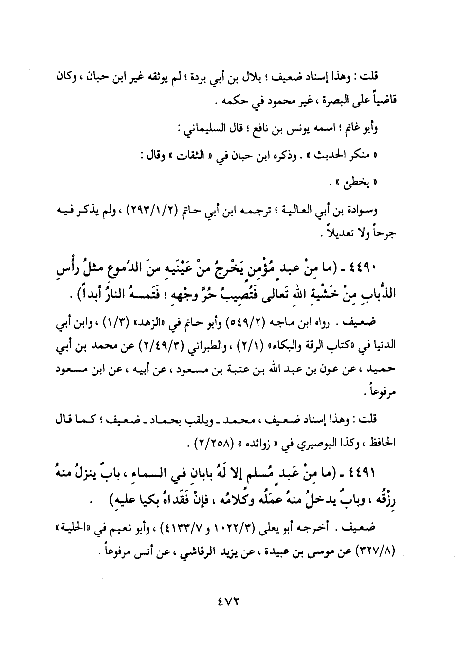 4491 - (ما من عبد مسلم إلا له بابان في السماء، باب ينزل منه رزقه، وباب يدخل منه عمله وكلامه، فإن فقداه بكيا عليه) .