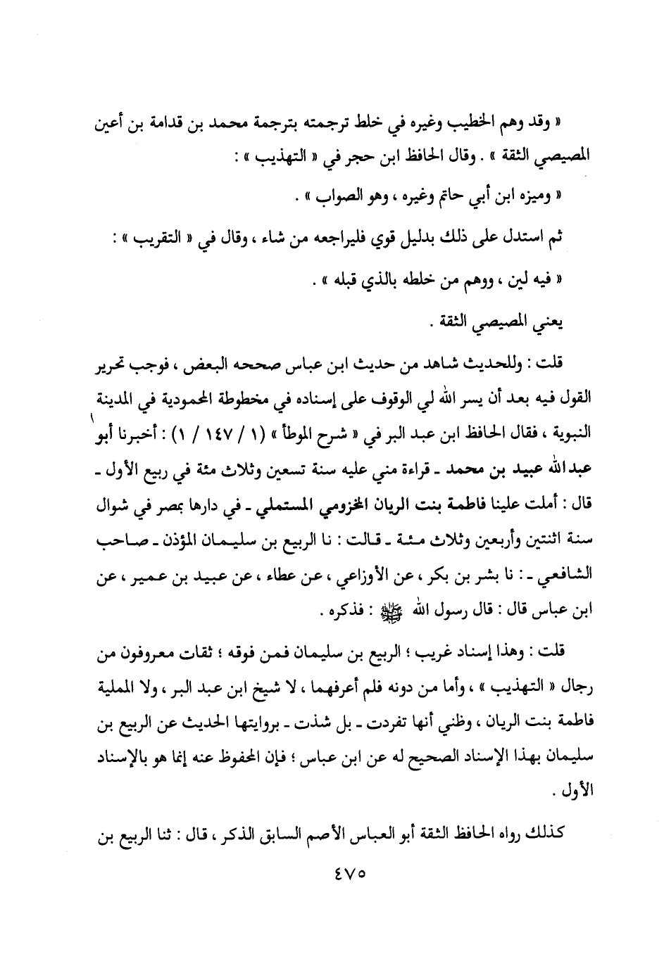 قلت: وللحديث شاهد من حديث ابن عباس صححه البعض، فوجب تحرير القول فيه بعد أن يسر الله لي الوقوف على إسناده في مخطوطة المحمودية في المدينة النبوية، فقال الحافظ ابن عبد البر في "شرح الموطأ" (1/ 147/ 1) : أخبرنا أبو عبد الله عبيد بن محمد - قراءة مني عليه سنة تسعين وثلاث مئة في ربيع الأول - قال: أملت علينا فاطمة بنت الريان المخزومي المستملي - في دارها بمصر في شوال سنة اثنتين وأربعين وثلاث مئة - قالت: أخبرنا الربيع بن سليمان المؤذن - صاحب الشافعي -: أخبرنا بشر بن بكر، عن الأوزاعي، عن عطاء، عن عبيد بن عمير، عن ابن عباس قال: قال رسول الله - صلى الله عليه وسلم -: فذكره.