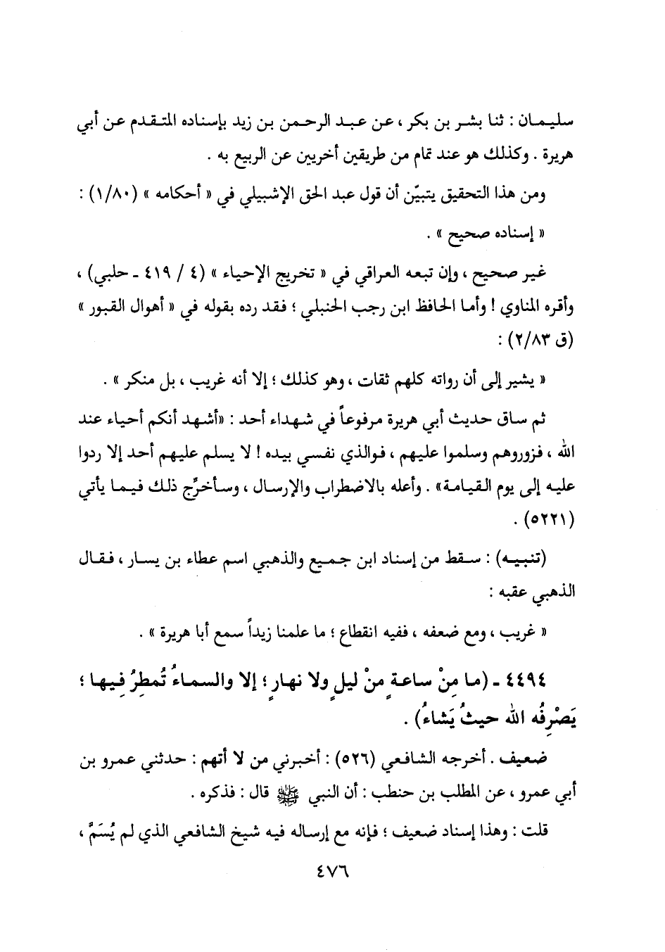 ثم ساق حديث أبي هريرة مرفوعاً في شهداء أحد: "أشهد أنكم أحياء عند الله، فزوروهم وسلموا عليهم، فوالذي نفسي بيده! لا يسلم عليهم أحد إلا ردوا عليه إلى يوم القيامة". وأعله بالاضطراب والإرسال، وسأخرج ذلك فيما يأتي (5221) .