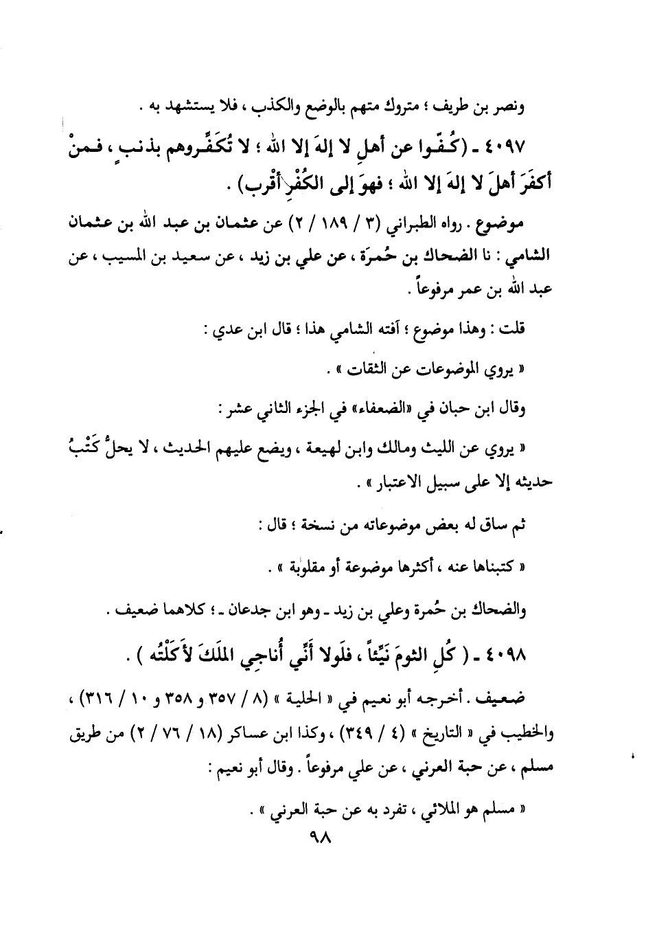 4097 - (كفوا عن أهل لا إله إلا الله؛ لا تكفروهم بذنب، فمن أكفر أهل لا إله إلا الله؛ فهو إلى الكفر أقرب) .