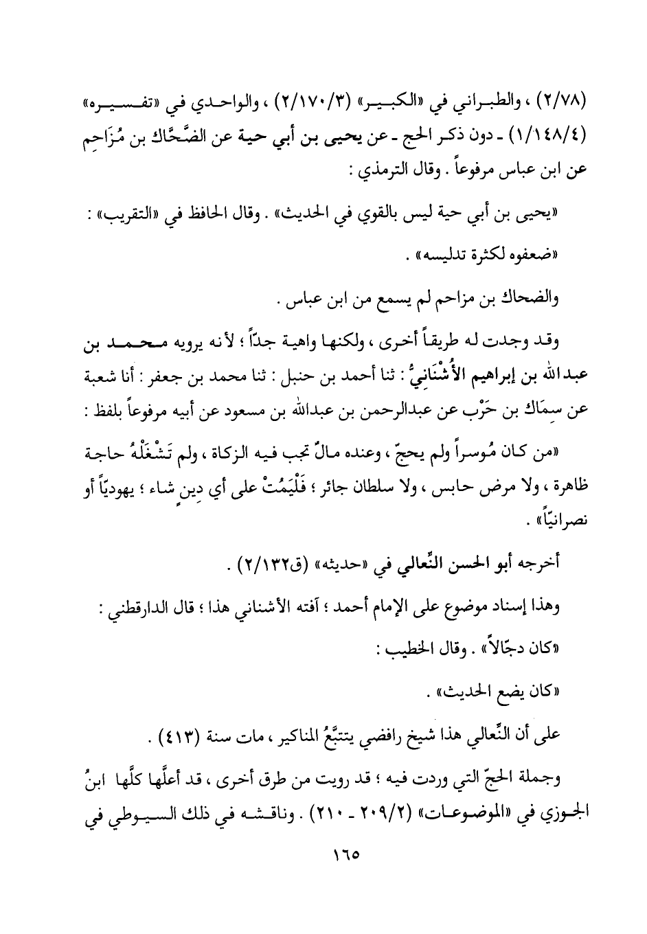 (78/ 2) ، والطبراني في "الكبير" (3/ 170/ 2) ، والواحدي في "تفسيره" (4/ 148/ 1) - دون ذكر الحج - عن يحيى بن أبي حية عن الضحاك بن مزاحم عن ابن عباس مرفوعاً. وقال الترمذي: