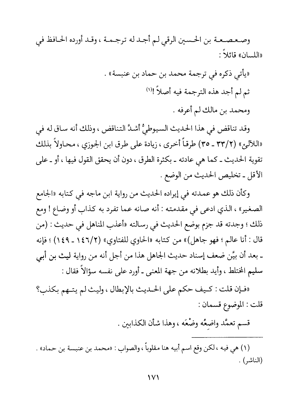 وكأن ذلك هو عمدته في إيراده الحديث من رواية ابن ماجه في كتابه "الجامع الصغير"، الذي ادعى في مقدمته: أنه صانه عما تفرد به كذاب أو وضاع! ومع ذلك؛ وجدته قد جزم بوضع الحديث في رسالته "أعذب المناهل في حديث: (من قال: أنبأنا عالم؛ فهو جاهل) " من كتابه "الحاوي للفتاوي" (2/ 146-149) ؛ فإنه - بعد أن بين ضعف إسناد حديث الجاهل هذا من أجل أنه من رواية ليث بن أبي سليم المختلط، وأريد بطلانه من جهة المعنى - أورد على نفسه سؤالاً فقال: