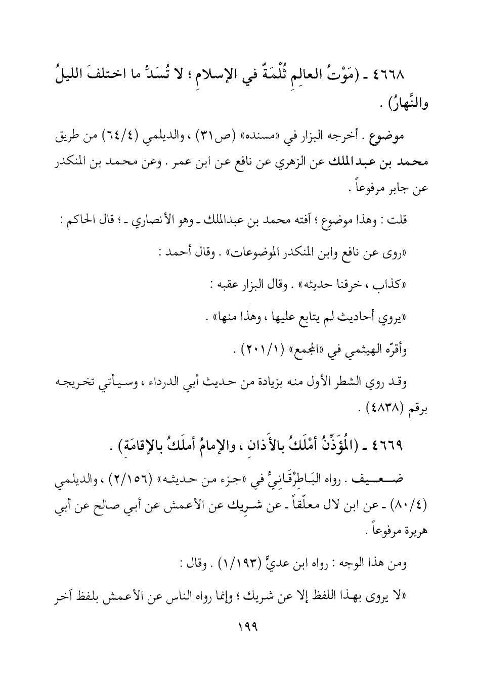 4668 - (موت العالم ثلمة في الإسلام؛ لا تسد ما اختلف الليل والنهار) .