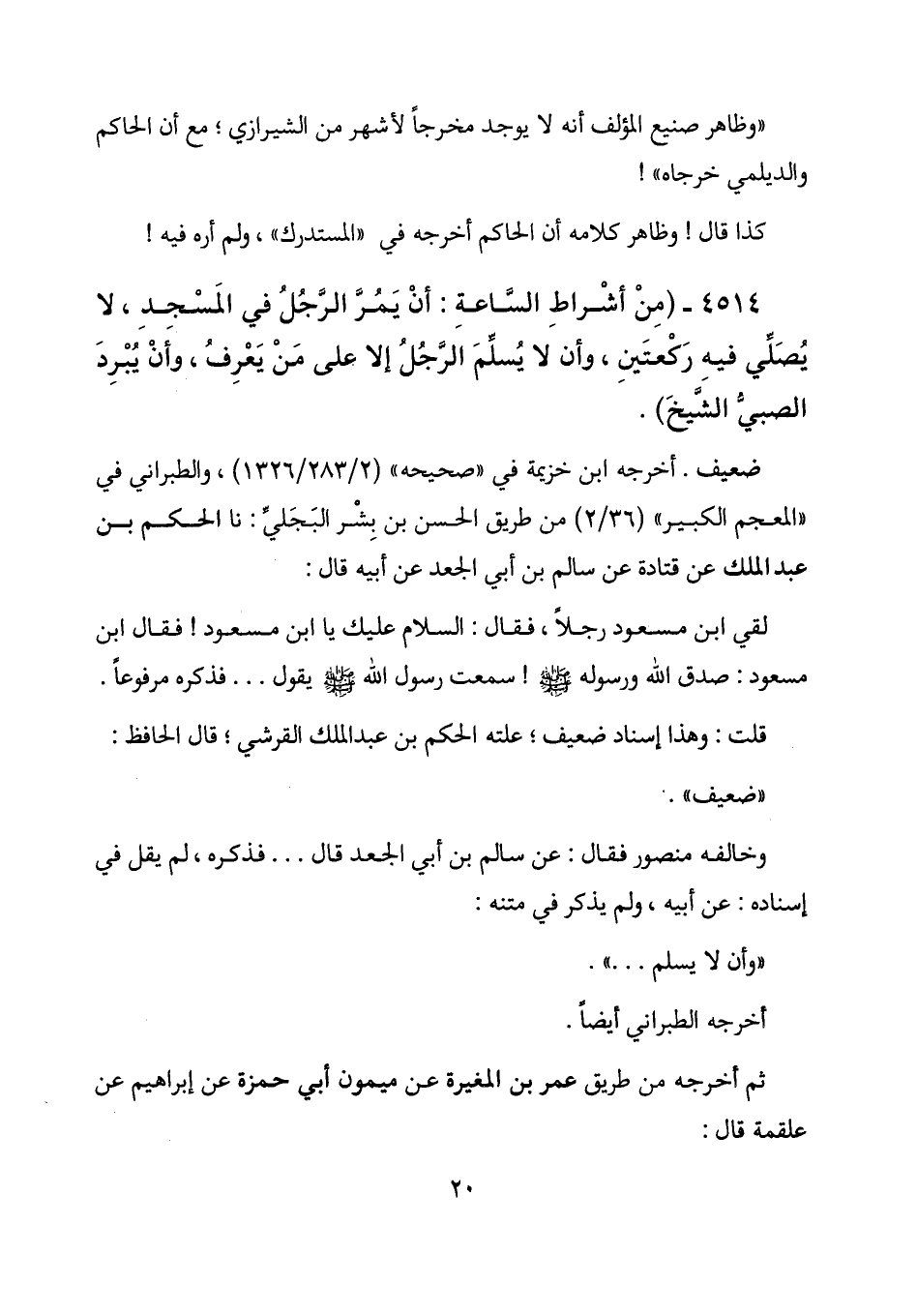 4514 - (من أشراط الساعة: أن يمر الرجل في المسجد، لا يصلي فيه ركعتين، وأن لا يسلم الرجل إلا على من يعرف، وأن يبرد الصبي الشيخ) .