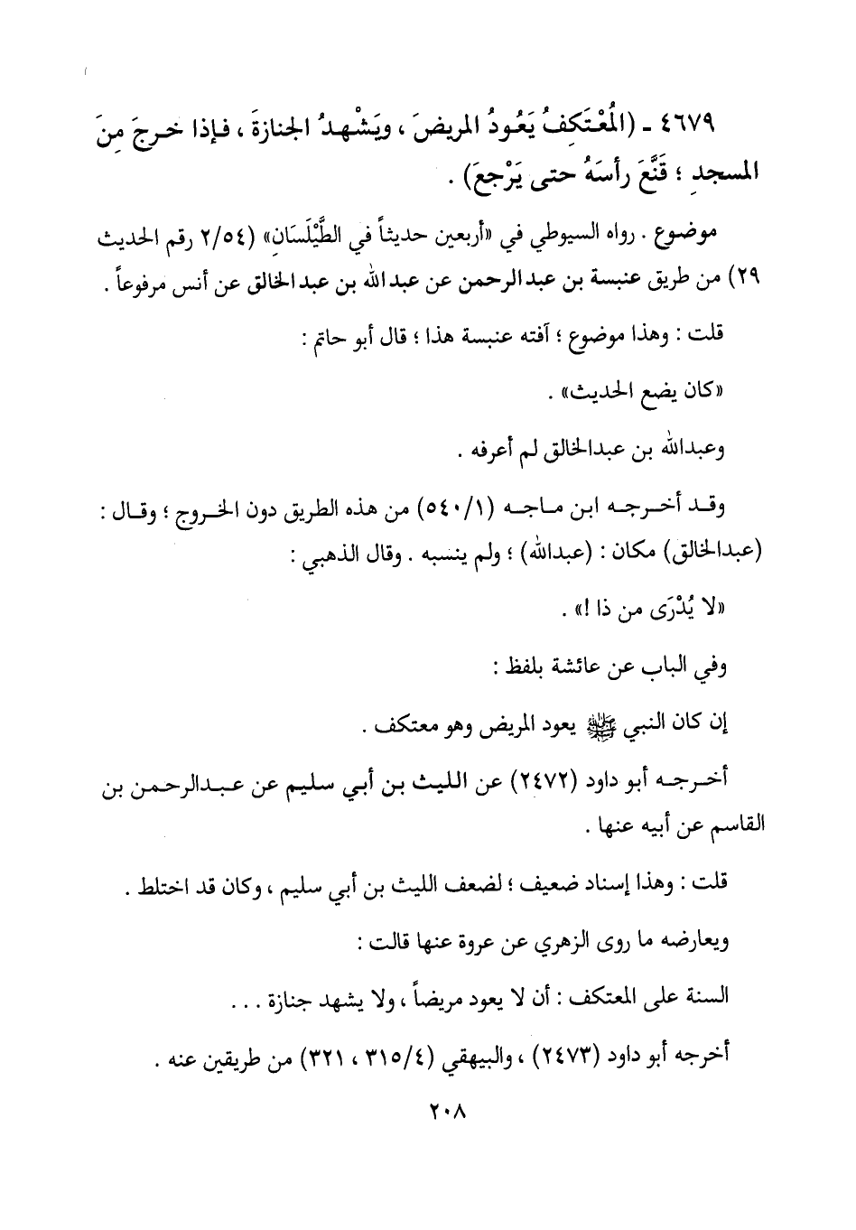 4679 - (المعتكف يعود المريض، ويشهد الجنازة، فإذا خرج من المسجد؛ قنع رأسه حتى يرجع) .