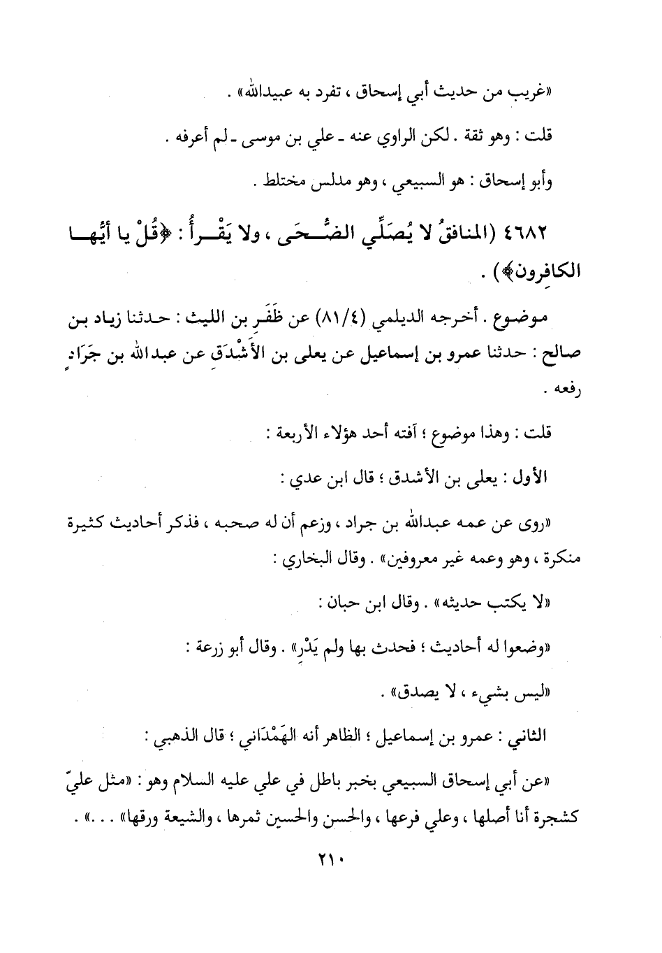 "عن أبي إسحاق السبيعي بخبر باطل في علي عليه السلام وهو: "مثل علي كشجرة أنا أصلها، وعلي فرعها، والحسن والحسين ثمرها، والشيعة ورقها" ... ".