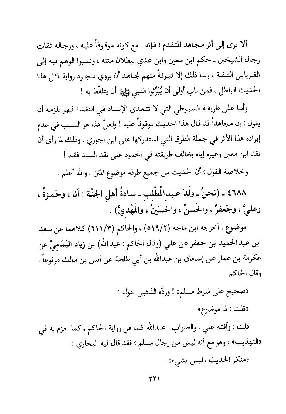 وأما على طريقة السيوطي التي لا تتعدى الإسناد في النقد؛ فهو يلزمه أن يقول: إن مجاهداً قد قال هذا الحديث موقوفاً عليه! ولعل هذا هو السبب في عدم إيراده هذا الأثر في جملة الطرق التي استدركها على ابن الجوزي، وذلك لما أرى أن نقد ابن معين وغيره إياه يخالف طريقته في الجمود على نقد السند فقط!