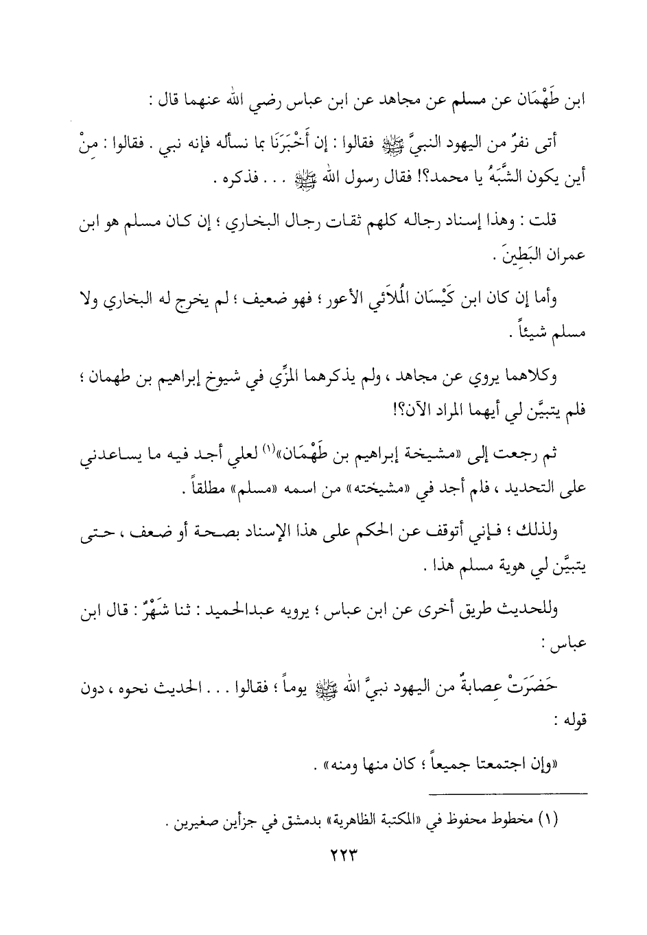 ثم رجعت إلى "مشيخة إبراهيم بن طهمان" (1) لعلي أجد فيه ما يساعدني على التحديد، فلم أجد في "مشيخته" من اسمه "مسلم" مطلقاً.