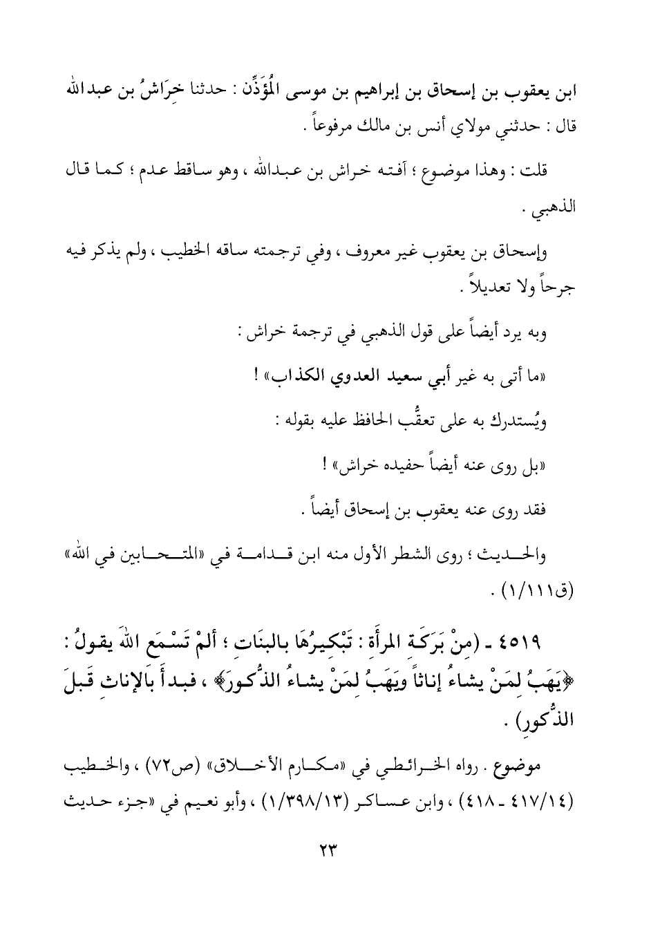 ابن يعقوب بن إسحاق بن إبراهيم بن موسى المؤذن: حدثنا خراش بن عبد الله قال: حدثني مولاي أنس بن مالك مرفوعاً.