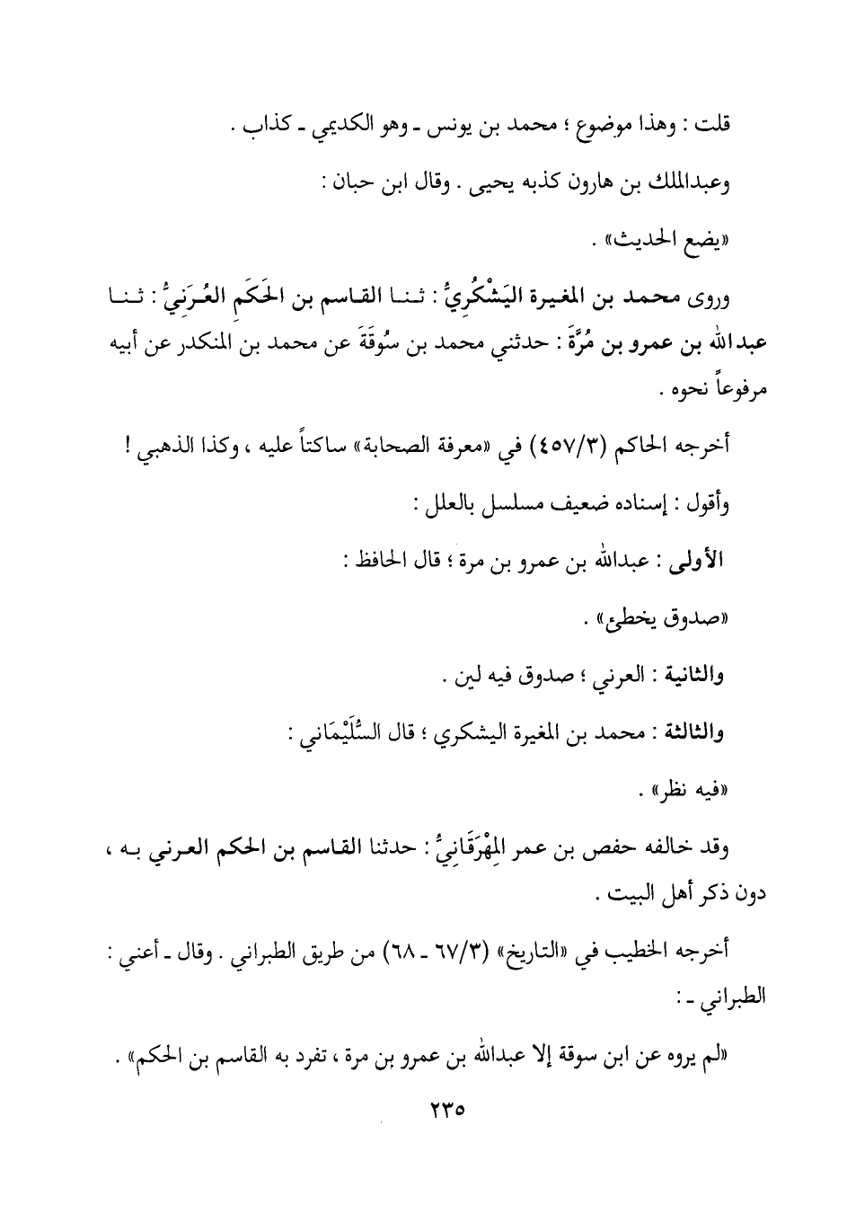 وروى محمد بن المغيرة اليشكري: حدثنا القاسم بن الحكم العرني: حدثنا عبد الله بن عمرو بن مرة: حدثني محمد بن سوقة عن محمد بن المنكدر عن أبيه مرفوعاً نحوه.