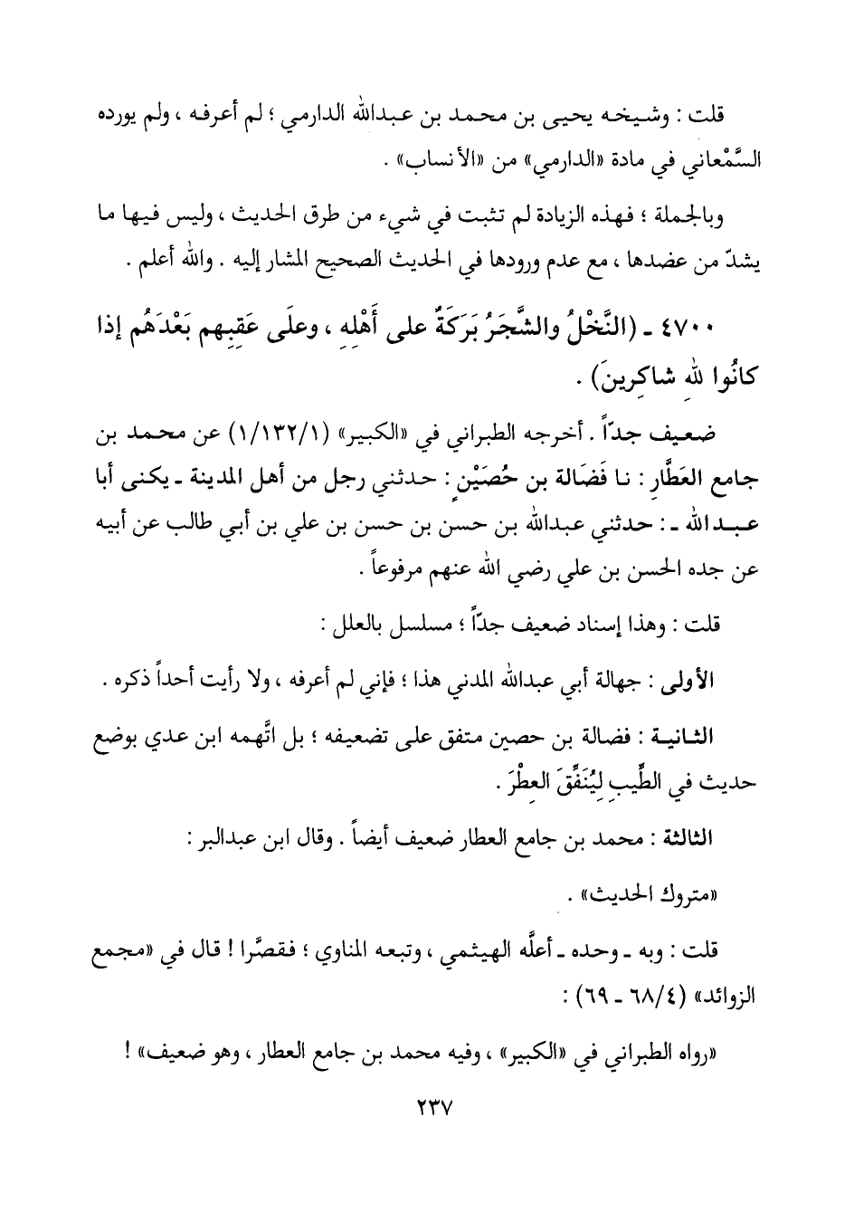"رواه الطبراني في "الكبير"، وفيه محمد بن جامع العطار، وهو ضعيف"!