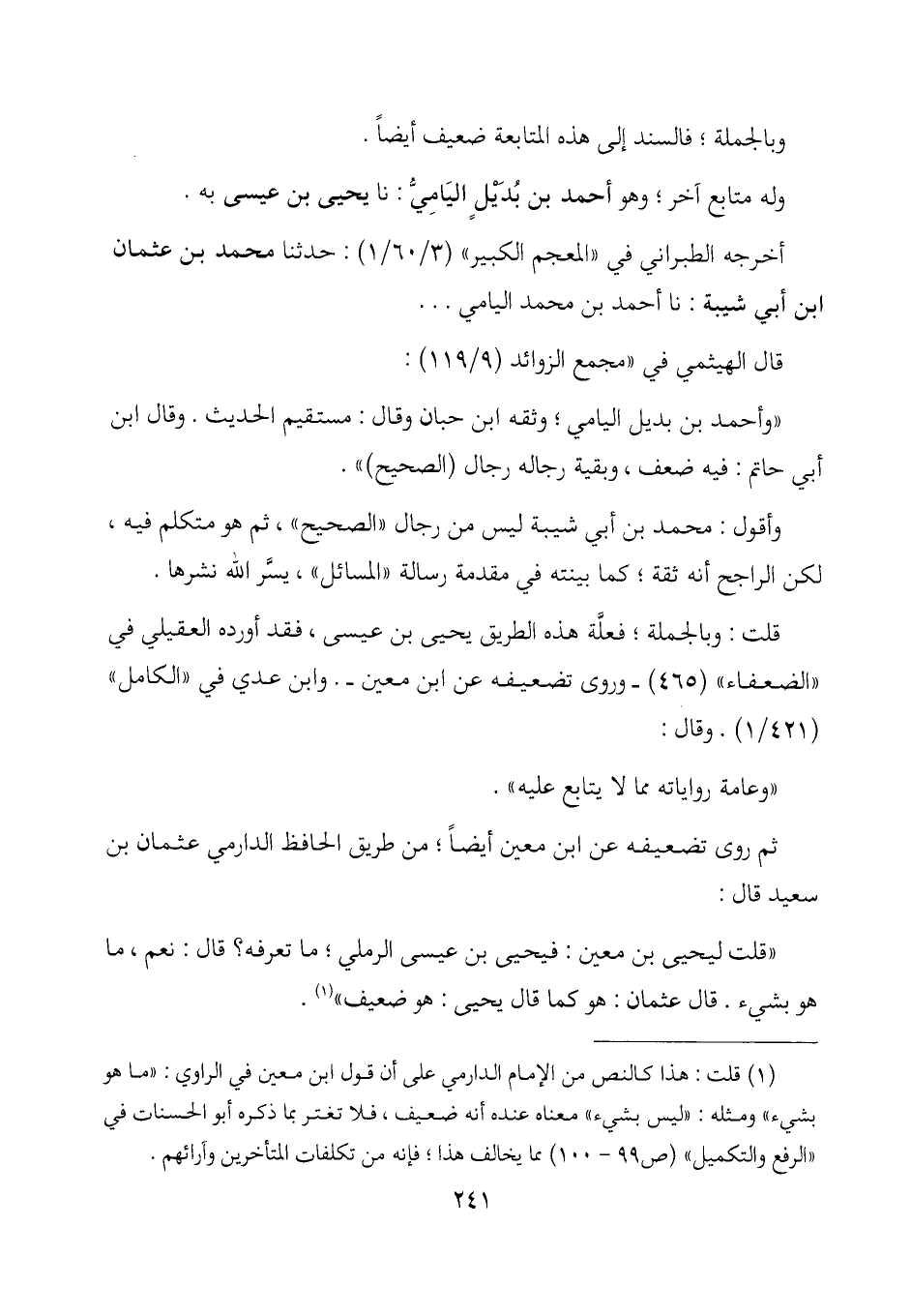 قلت: وبالجملة؛ فعلة هذه الطريق يحيى بن عيسى، فقد أورده العقيلي في "الضعفاء" (465) - وروى تضعيفه عن ابن معين -. وابن عدي في "الكامل" (421/ 1) . وقال: