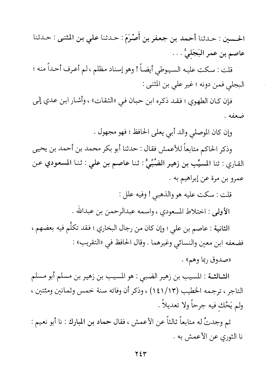 الحسين: حدثنا أحمد بن جعفر بن أصرم: حدثنا علي بن المثنى: حدثنا عاصم بن عمر البجلي ...