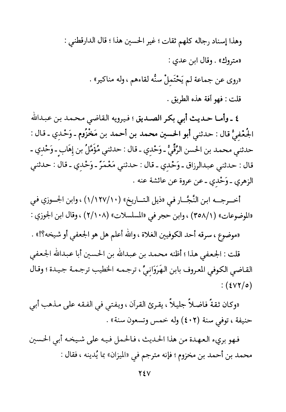 4- وأما حديث أبي بكر الصديق؛ فيرويه القاضي محمد بن عبد الله الجعفي قال: حدثني أبو الحسين محمد بن أحمد بن مخزوم - وحدي - قال: حدثني محمد بن الحسن الرقي - وحدي - قال: حدثني مؤمل بن إهاب - وحدي - قال: حدثني عبد الرزاق - وحدي - قال: حدثني معمر - وحدي - قال: حدثني الزهري - وحدي - عن عروة عن عائشة عنه.