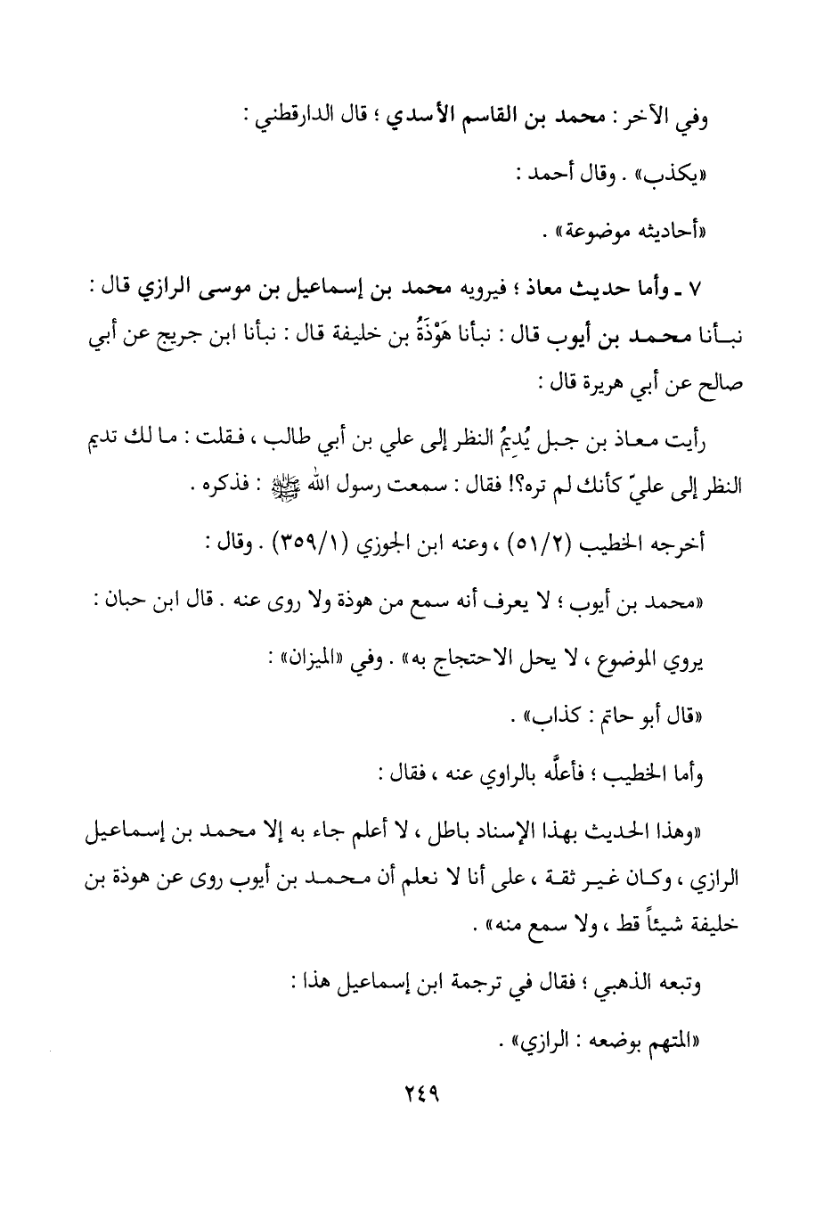 7- وأما حديث معاذ؛ فيرويه محمد بن إسماعيل بن موسى الرازي قال: نبأنا محمد بن أيوب قال: نبأنا هوذة بن خليفة قال: نبأنا ابن جريج عن أبي صالح عن أبي هريرة قال: