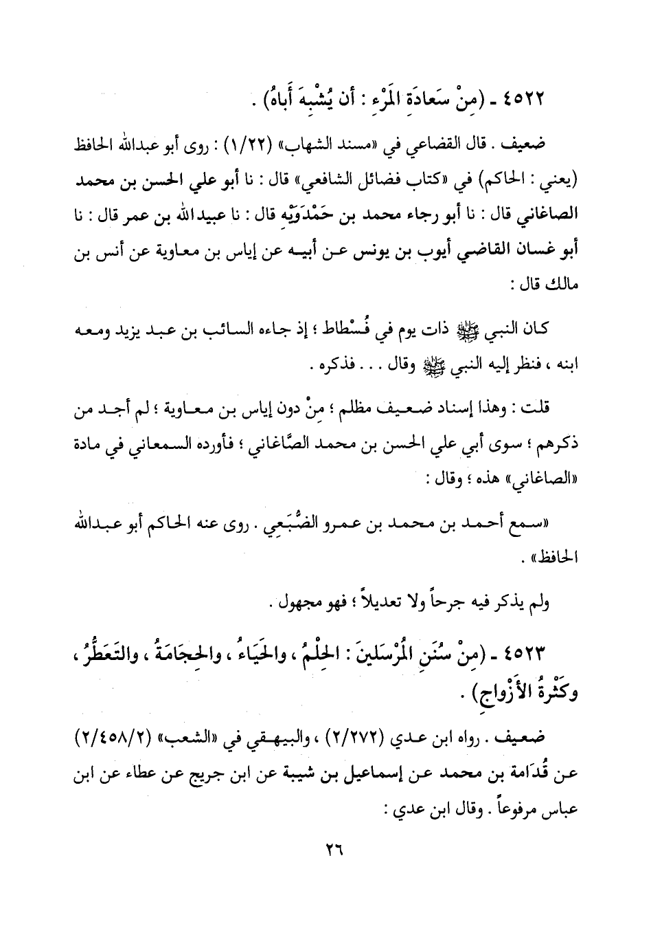 قلت: وهذا إسناد ضعيف مظلم؛ من دون إياس بن معاوية؛ لم أجد من ذكرهم؛ سوى أبي علي الحسن بن محمد الصاغاني؛ فأورده السمعاني في مادة "الصاغاني" هذه؛ وقال: