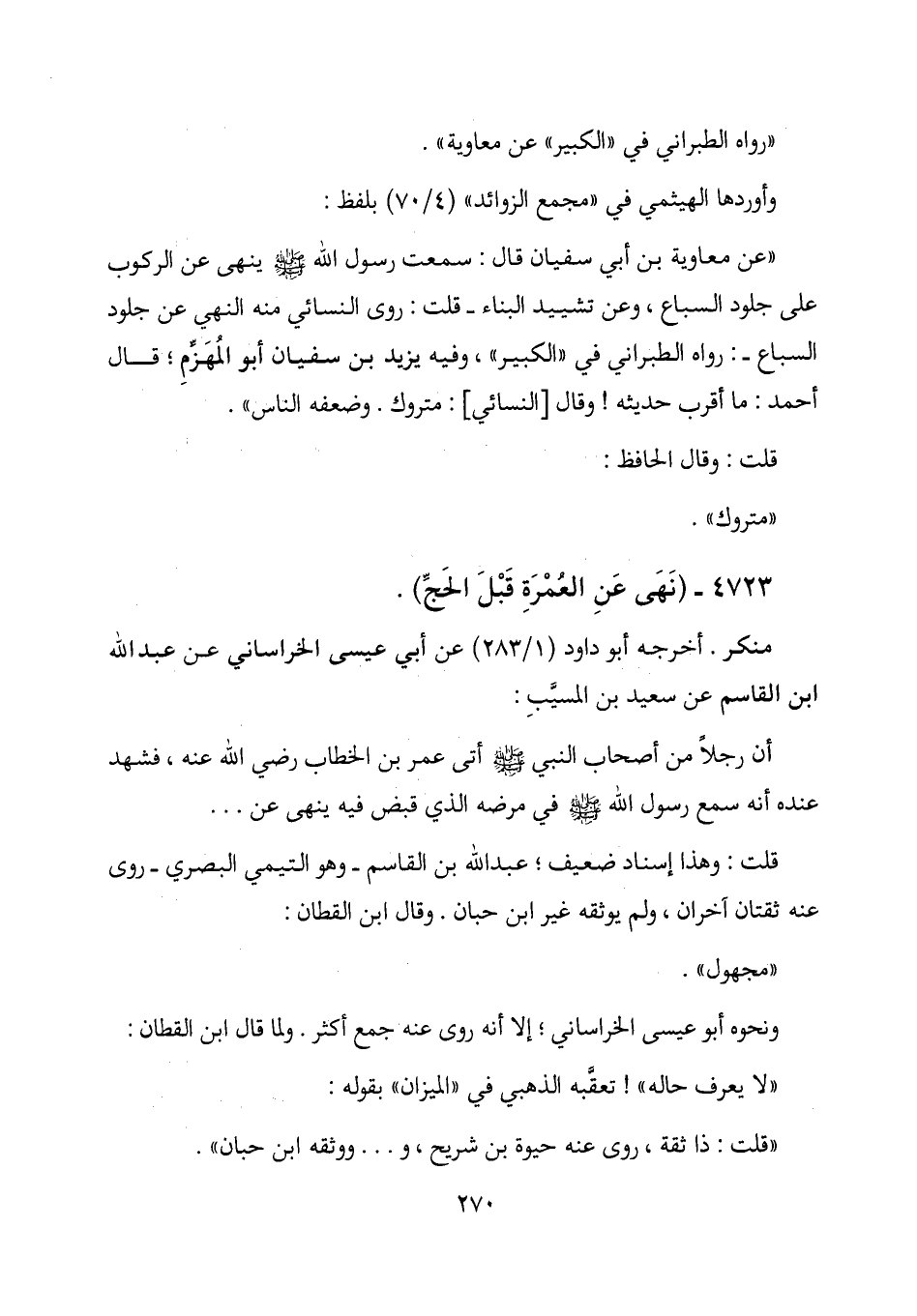 "عن معاوية بن أبي سفيان قال: سمعت رسول الله - صلى الله عليه وسلم - ينهى عن الركوب على جلود السباع، وعن تشييد البناء - قلت: روى النسائي منه النهي عن جلود السباع -: رواه الطبراني في "الكبير"، وفيه يزيد بن سفيان أبو المهزم؛ قال أحمد: ما أقرب حديثه! وقال [النسائي] : متروك. وضعفه الناس".